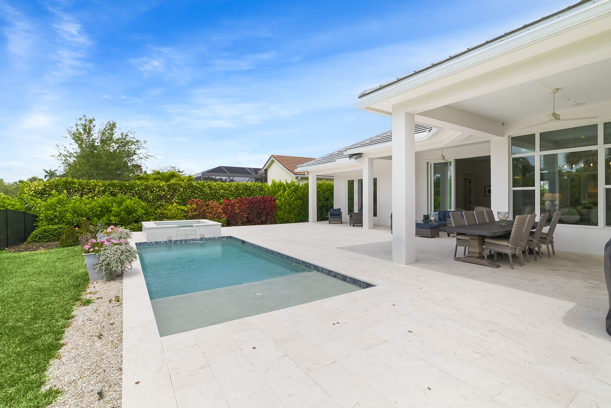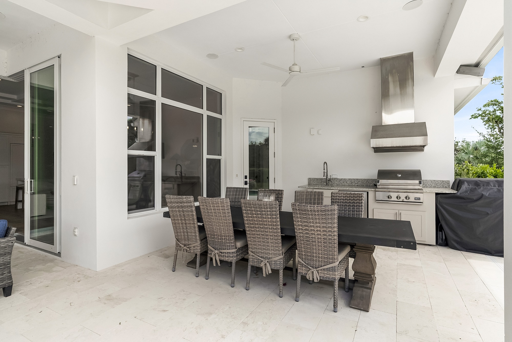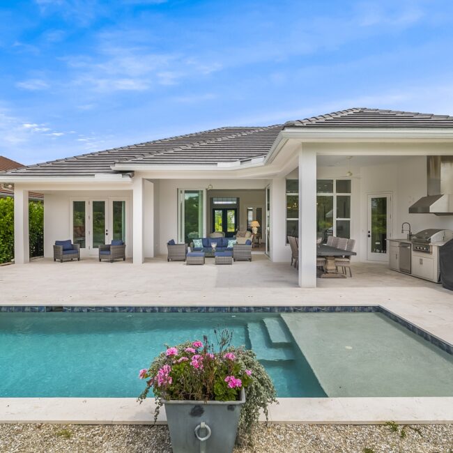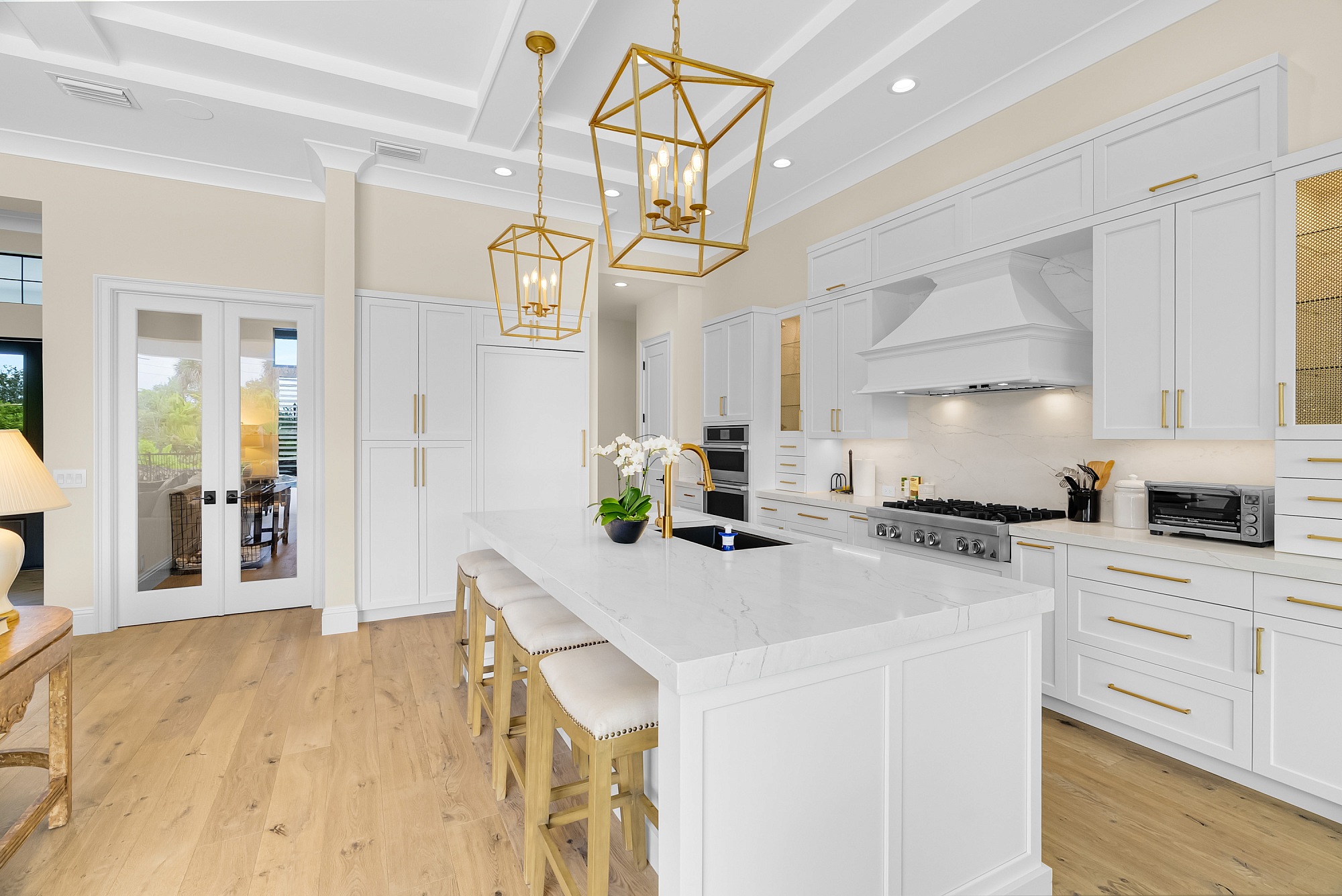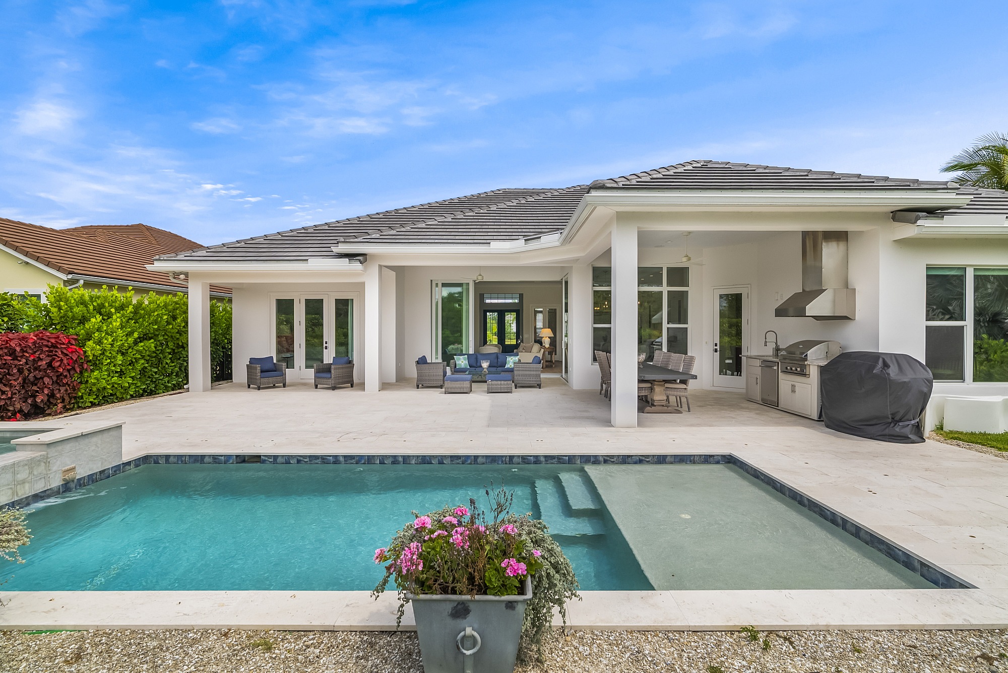 This stunning 3-bedroom, 3.5 -bath home with a den and bonus room showcases European White Oak floors throughout the main living areas and primary suite. The gourmet kitchen features a center island, custom cabinetry, a gas range, and top-tier appliances—perfect for both everyday living and entertaining. Enjoy the ultimate indoor-outdoor lifestyle with telescoping sliders that open to a resort-style pool with sun shelf, waterfall spa, and a fully equipped outdoor kitchen with gas grill—all oriented to take advantage of the desirable southern exposure.