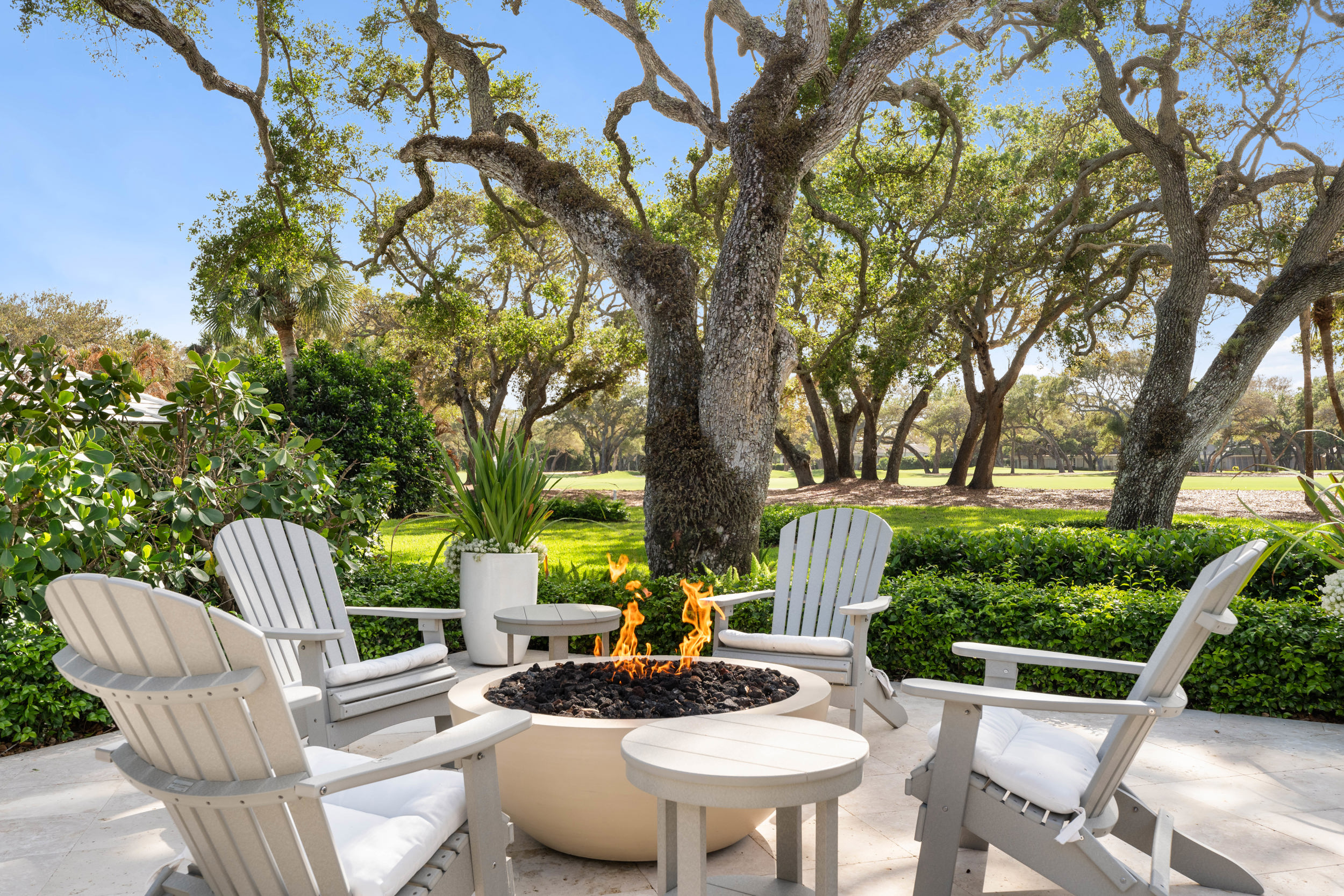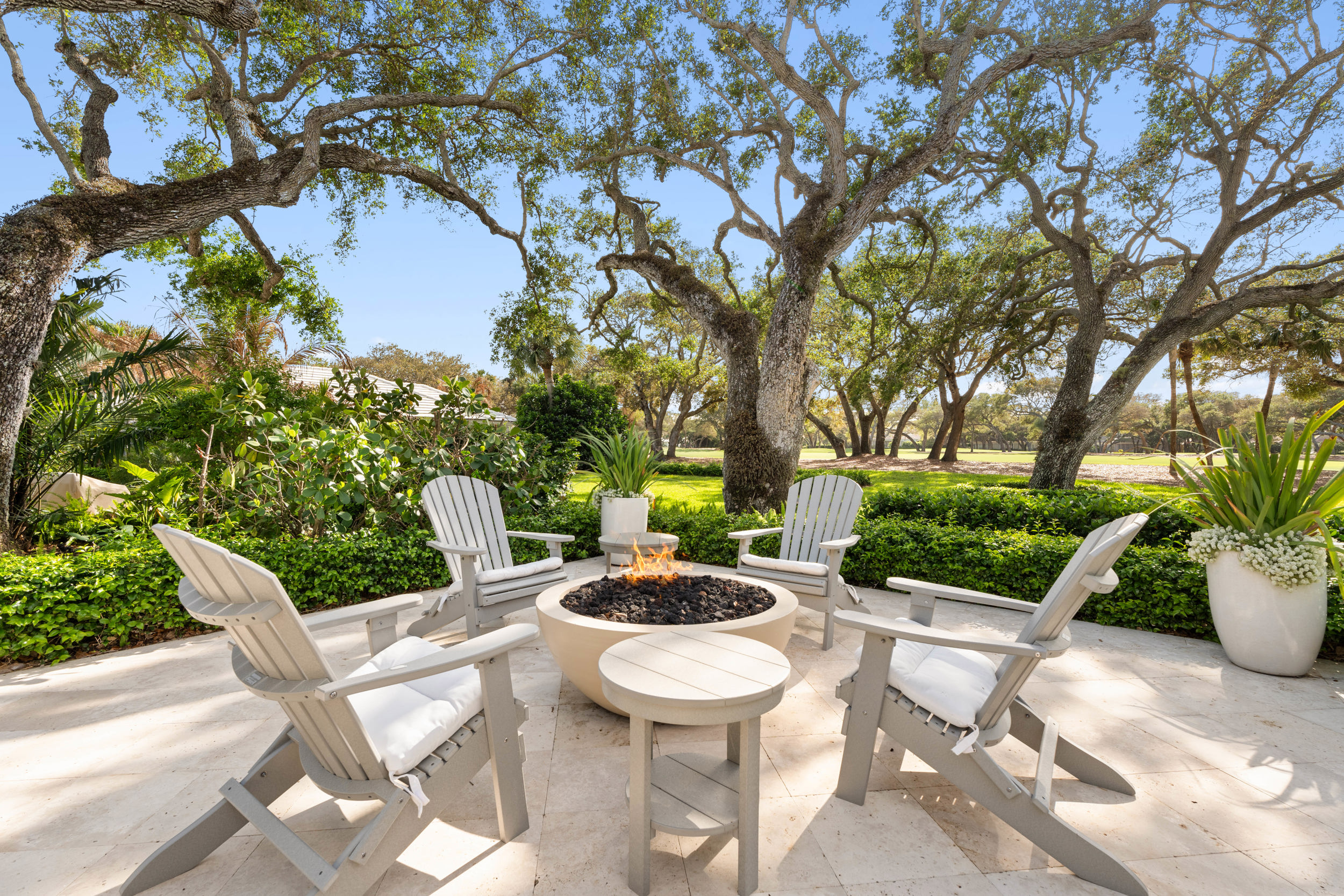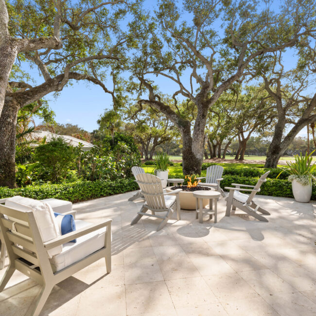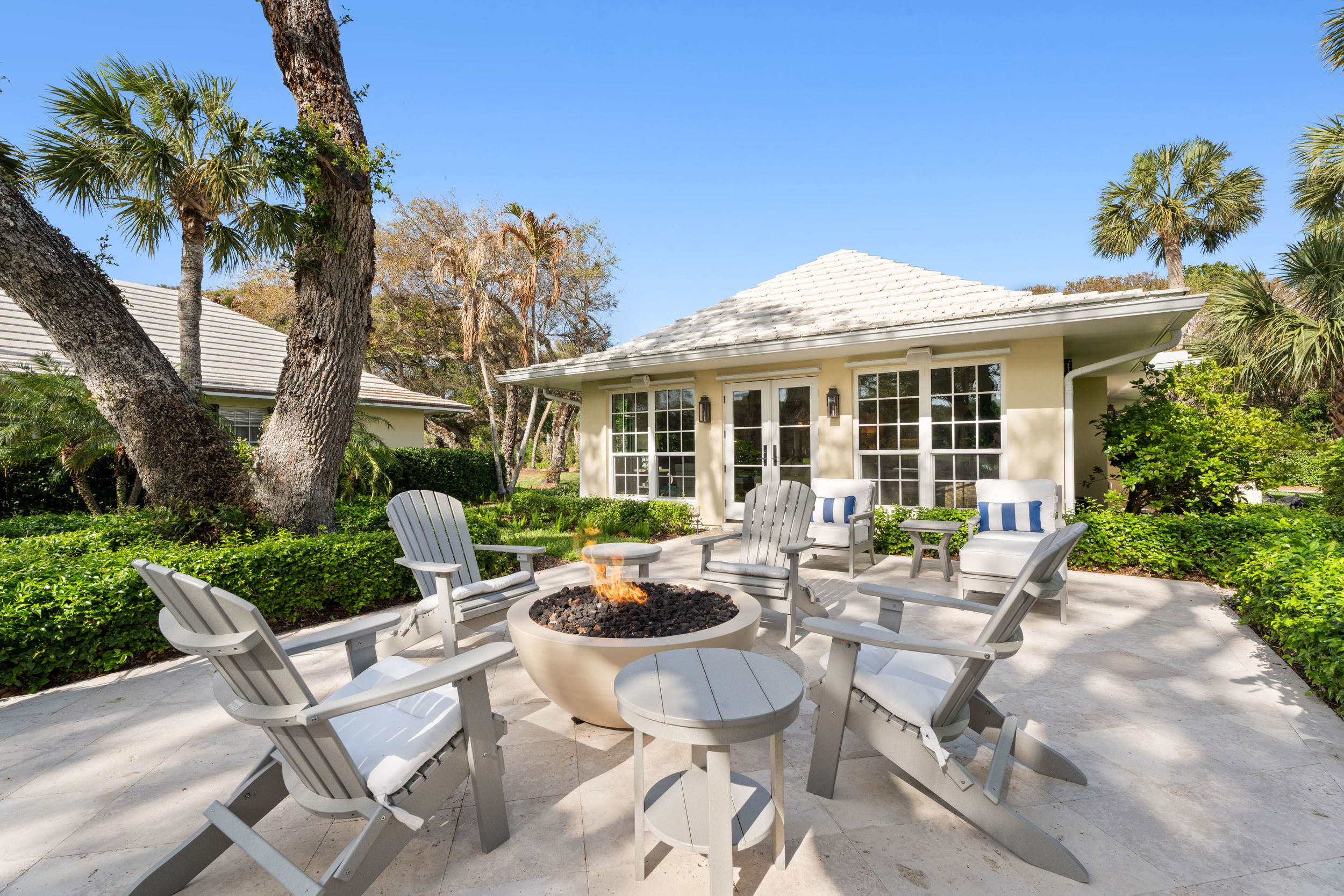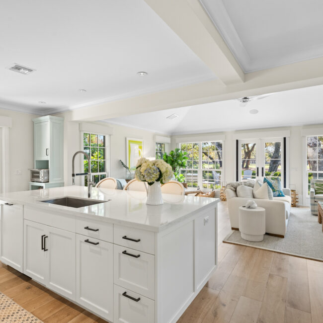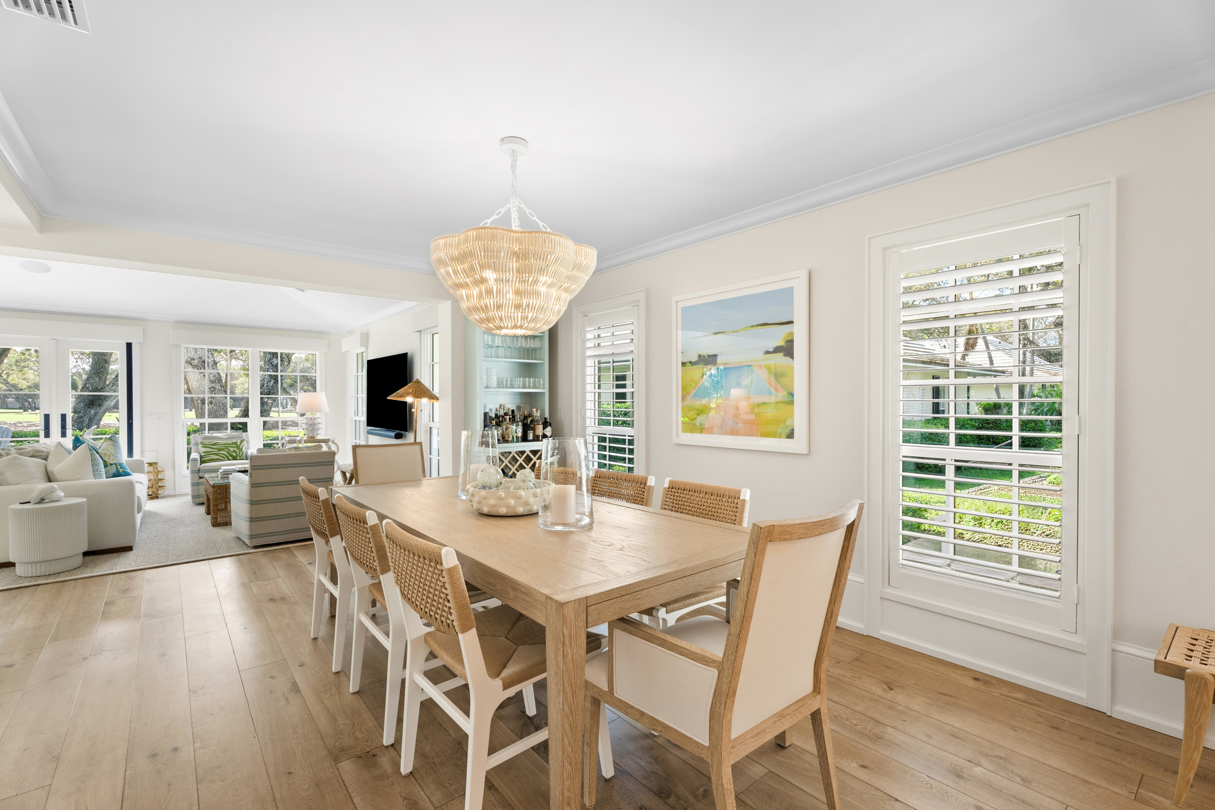 At the heart of the home, a light-filled, open-concept kitchen with an integrated dining area flows effortlessly into multiple inviting living spaces, offering a seamless layout ideal for both relaxed everyday living and sophisticated entertaining. Rich engineered white oak flooring runs throughout, complementing custom millwork, built-ins, and a well-appointed gas range that will delight any home chef. Generous closet space and smart storage solutions further enhance the home’s livability.Originally renovated in 2018, the residence has been meticulously maintained, striking a perfect balance between classic design and modern convenience. Every detail has been carefully considered to create a warm yet elevated atmosphere.Step outside to the expansive patio, where a striking fire bowl sets the stage for unforgettable evenings. Here, you’ll enjoy breathtaking sunsets overlooking the tranquil surroundings—an idyllic backdrop for gathering with family and friends or simply unwinding in total serenity.