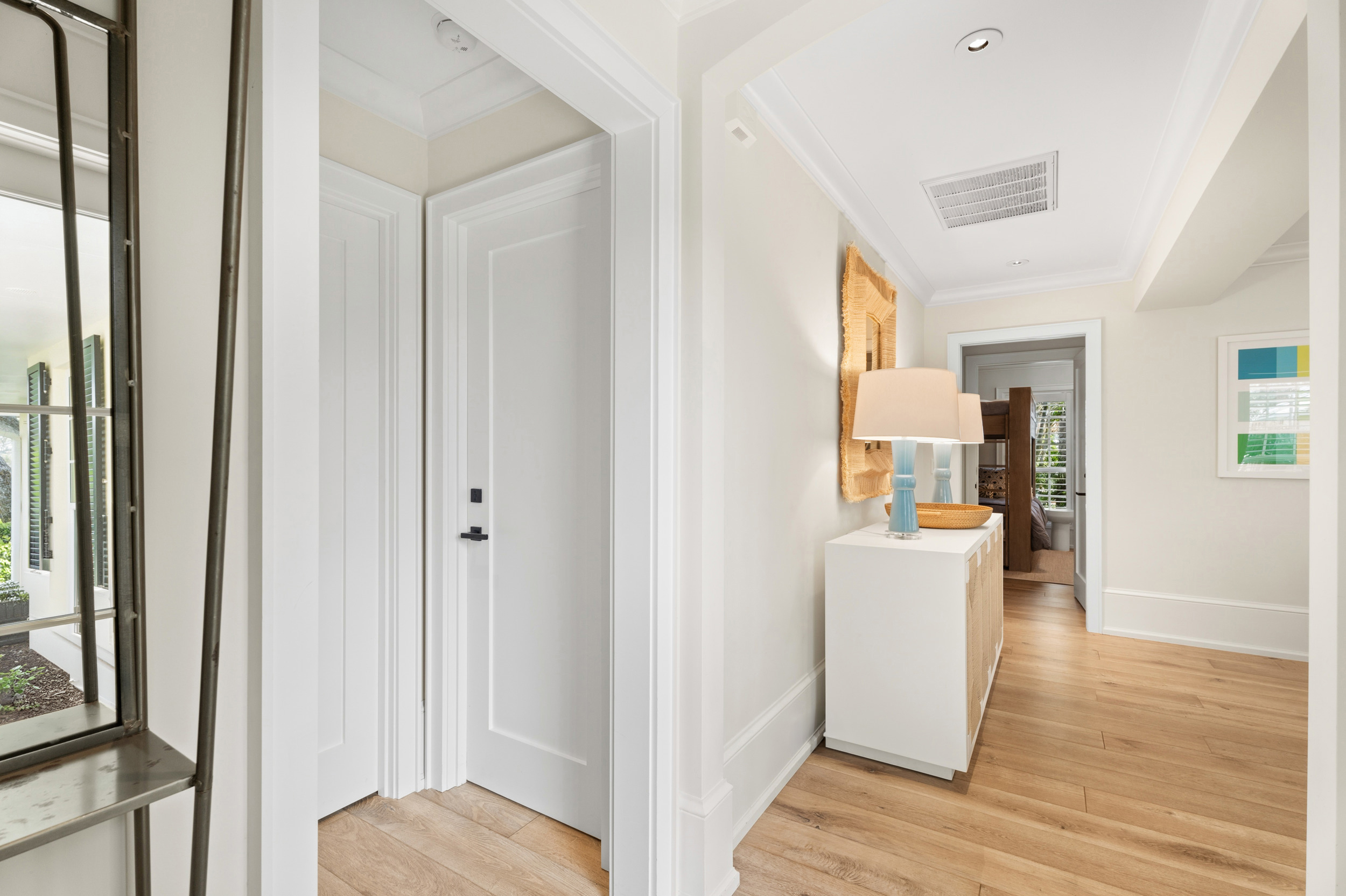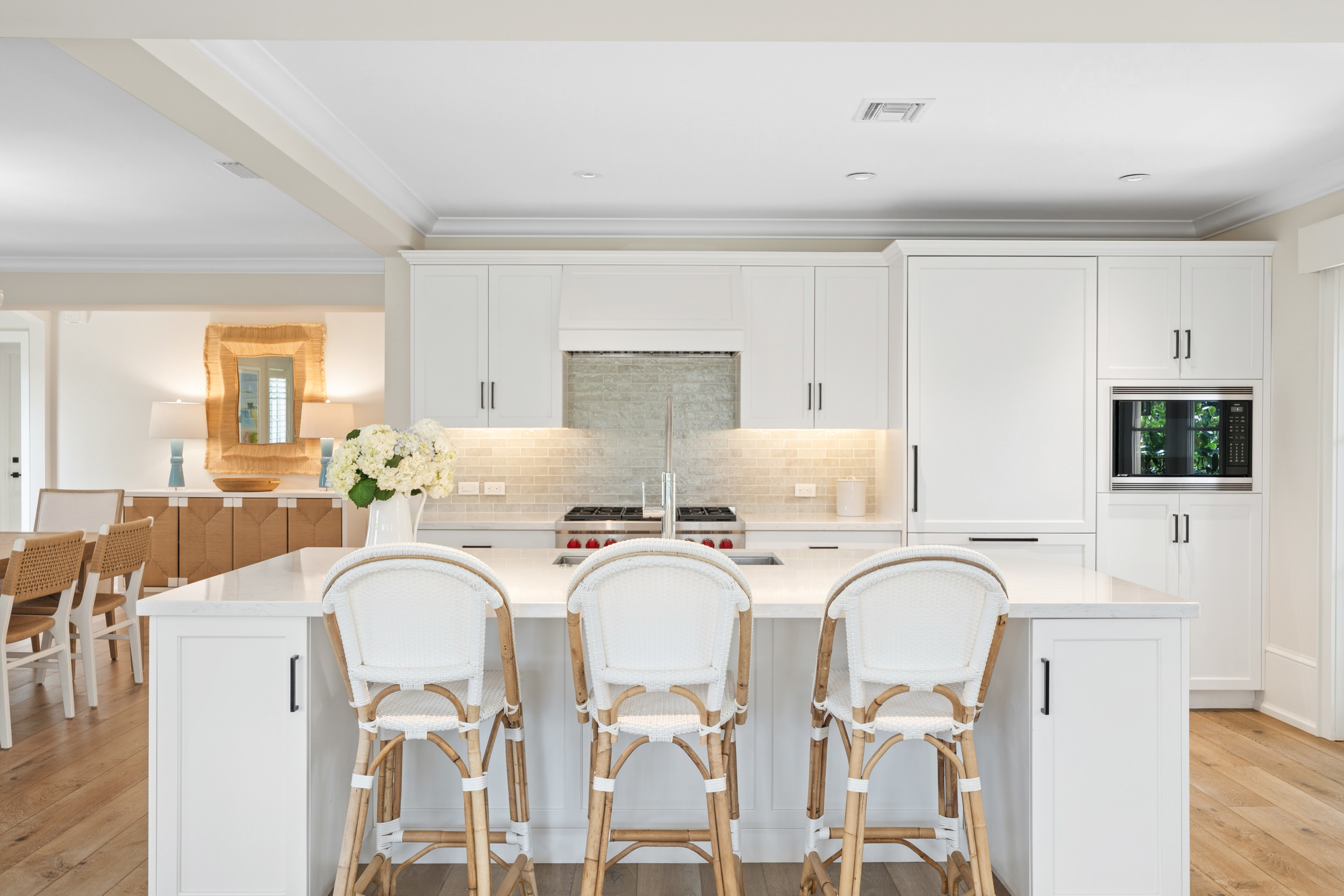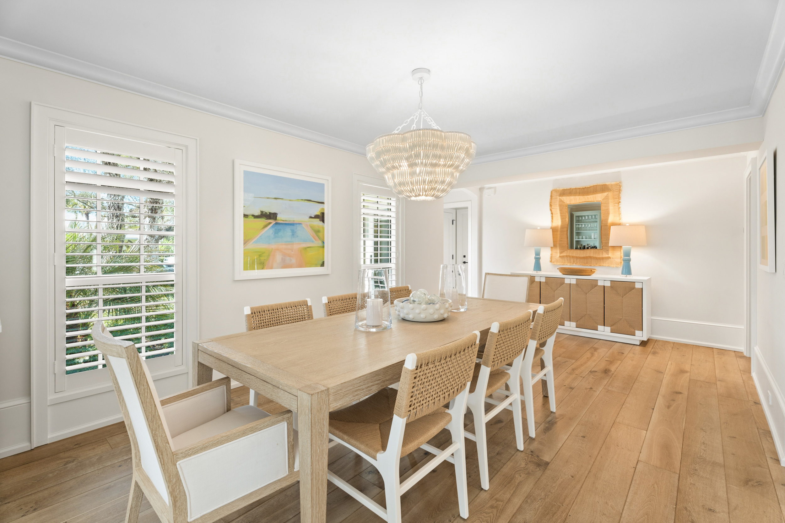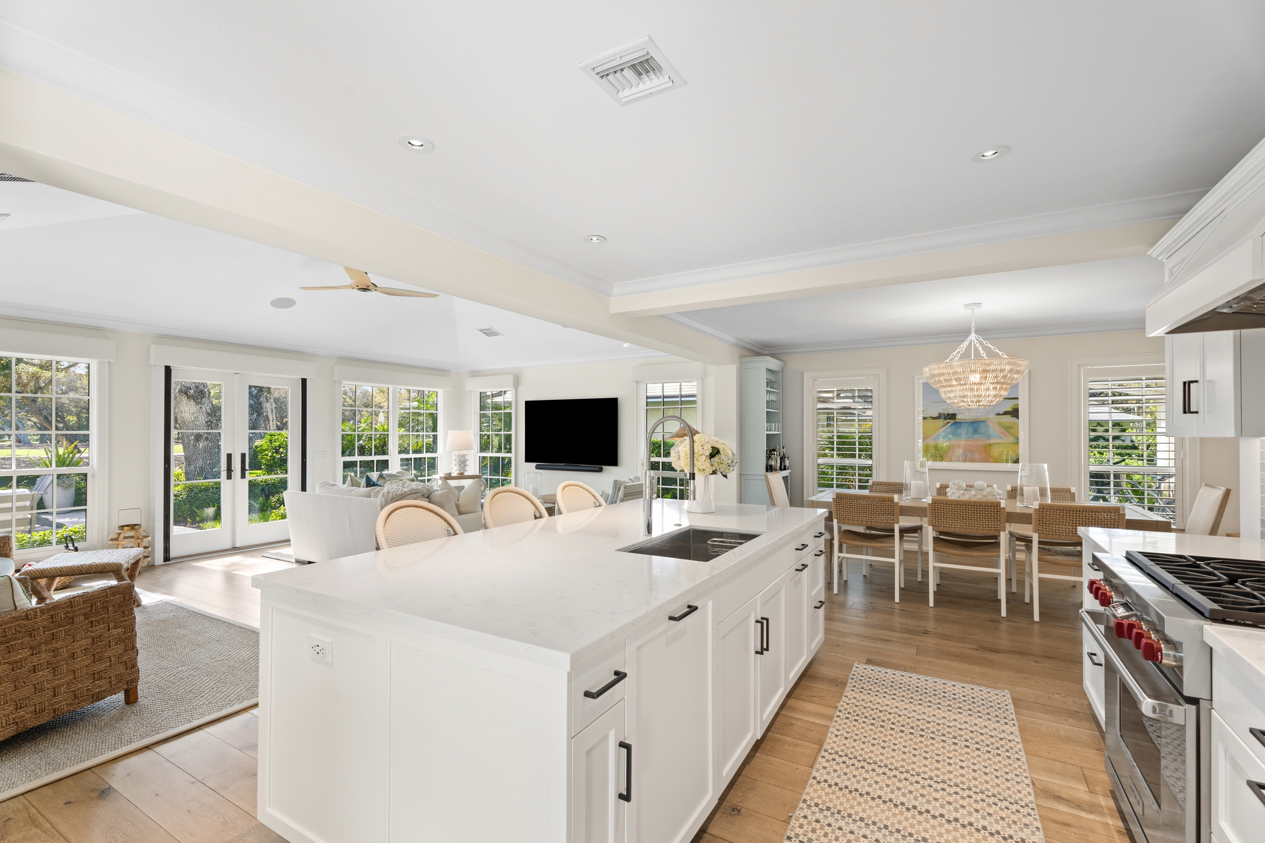At the heart of the home, a light-filled, open-concept kitchen with an integrated dining area flows effortlessly into multiple inviting living spaces, offering a seamless layout ideal for both relaxed everyday living and sophisticated entertaining. Rich engineered white oak flooring runs throughout, complementing custom millwork, built-ins, and a well-appointed gas range that will delight any home chef. Generous closet space and smart storage solutions further enhance the home’s livability.Originally renovated in 2018, the residence has been meticulously maintained, striking a perfect balance between classic design and modern convenience. Every detail has been carefully considered to create a warm yet elevated atmosphere.Step outside to the expansive patio, where a striking fire bowl sets the stage for unforgettable evenings. Here, you’ll enjoy breathtaking sunsets overlooking the tranquil surroundings—an idyllic backdrop for gathering with family and friends or simply unwinding in total serenity.