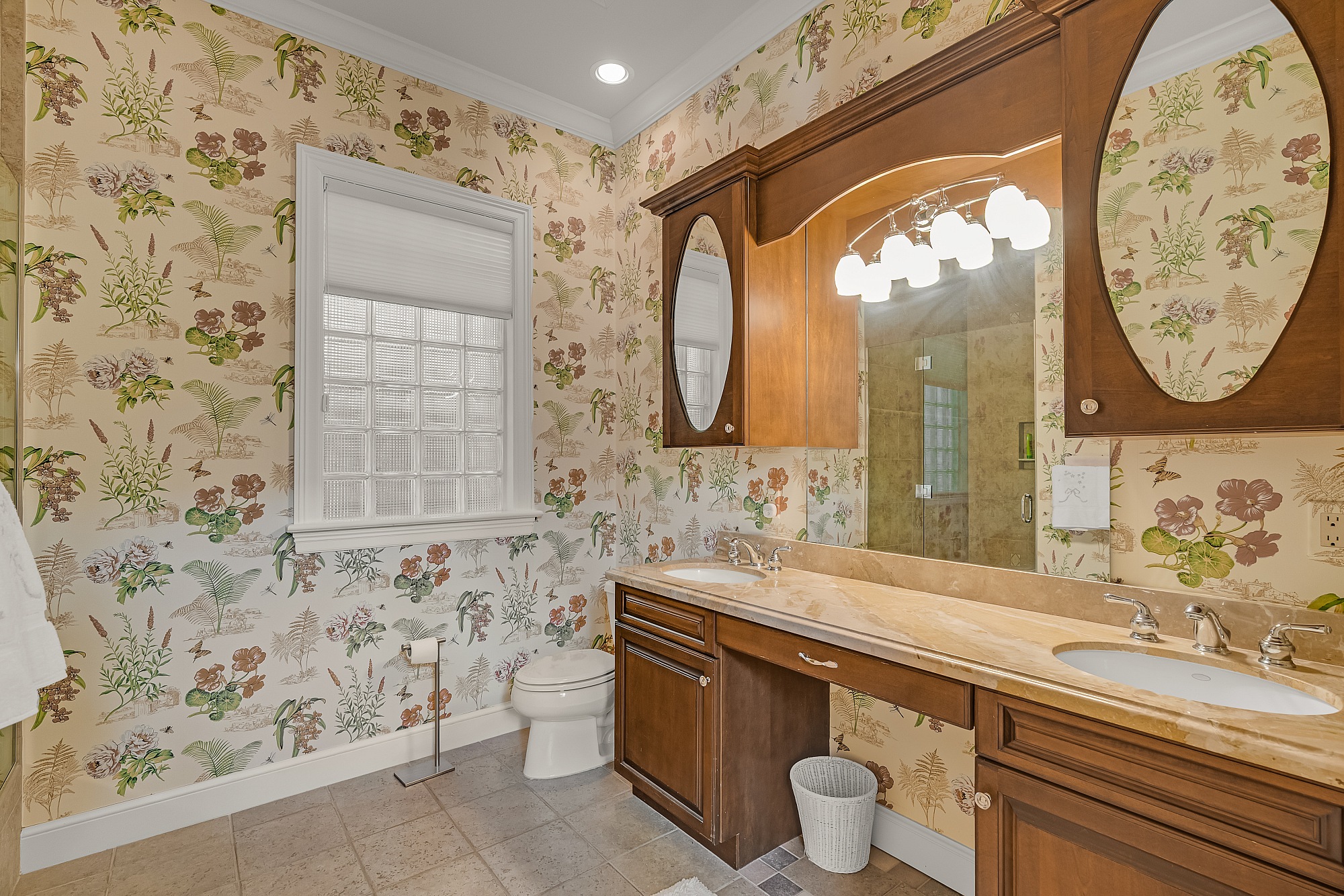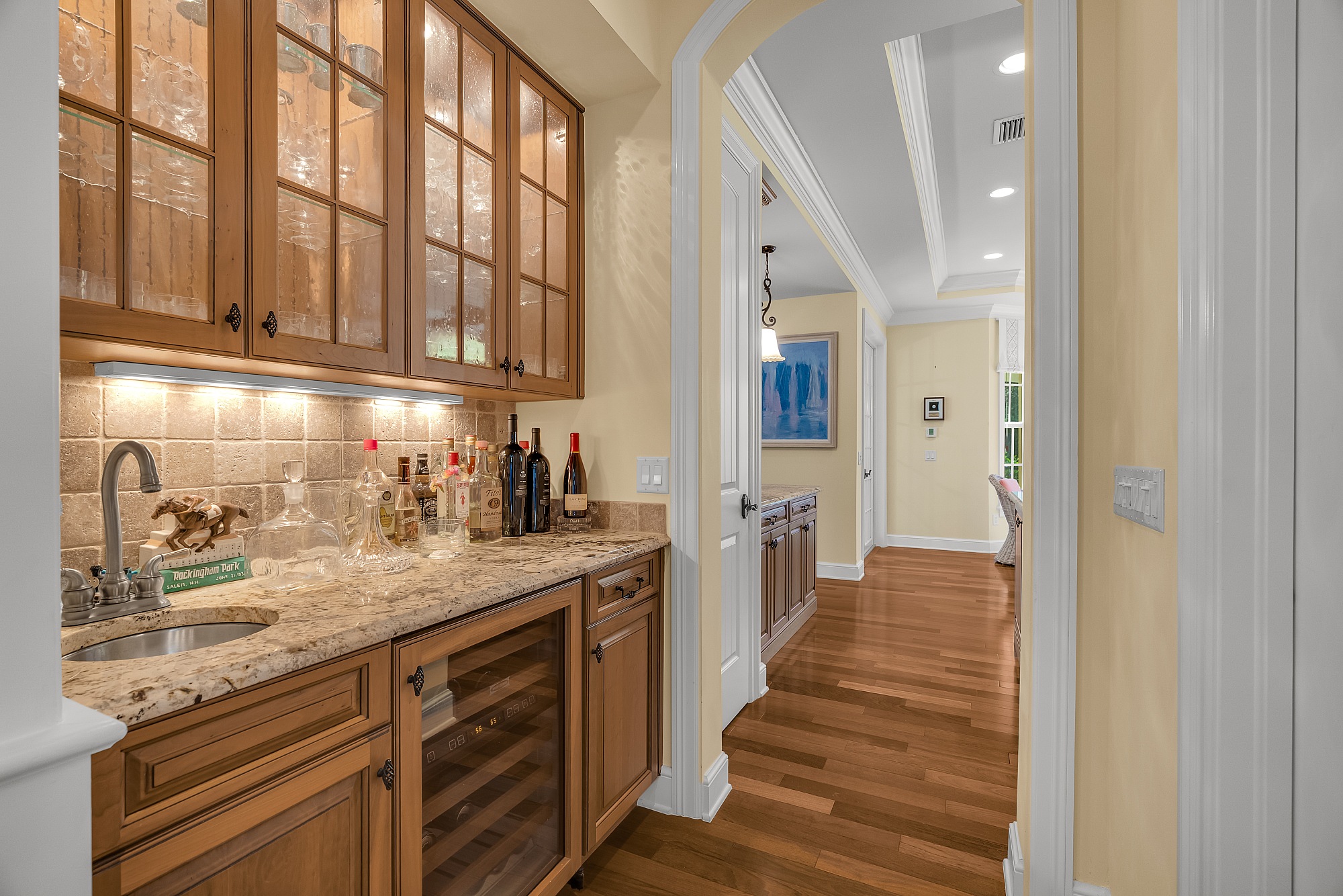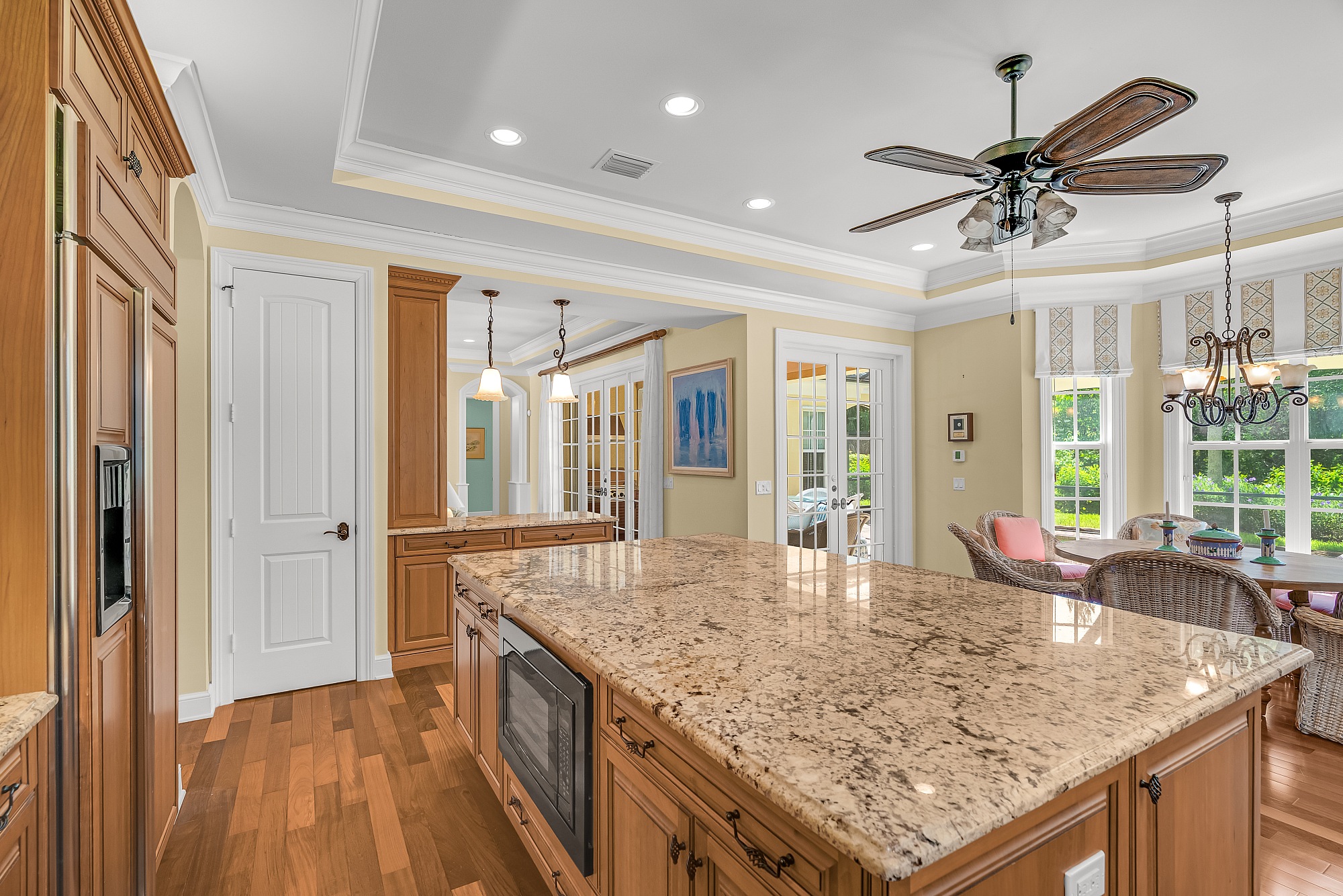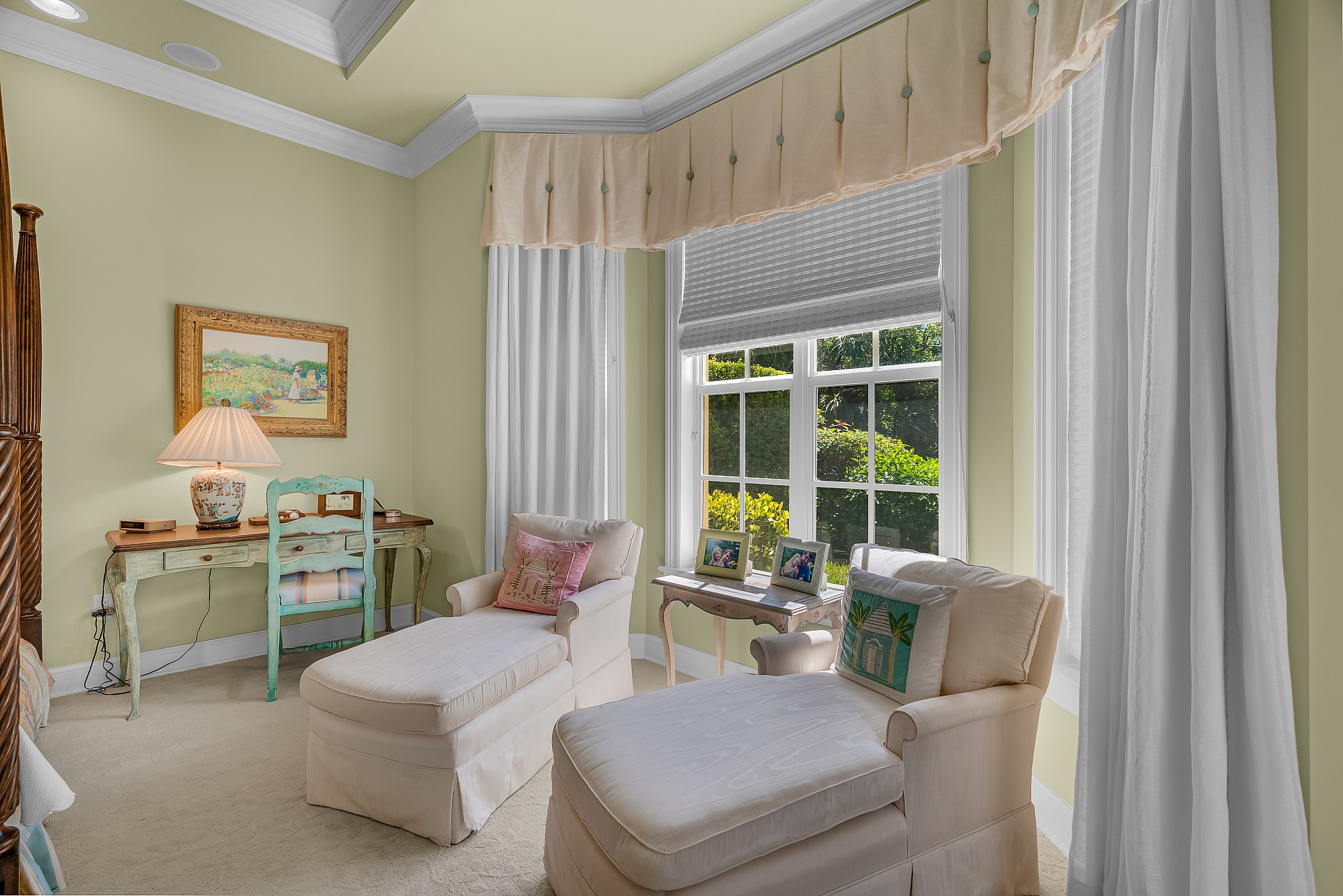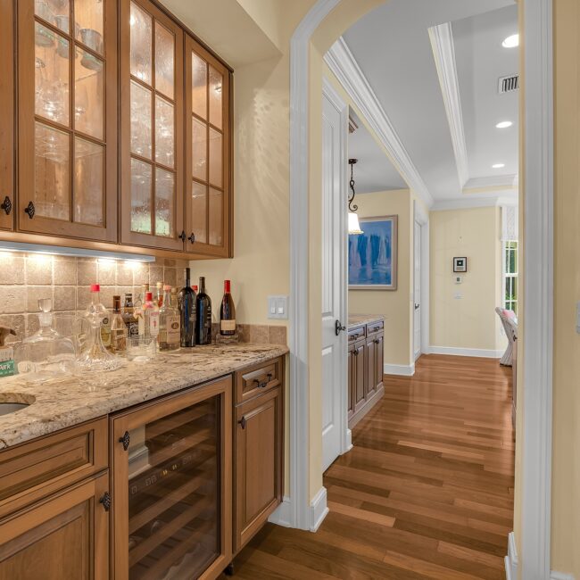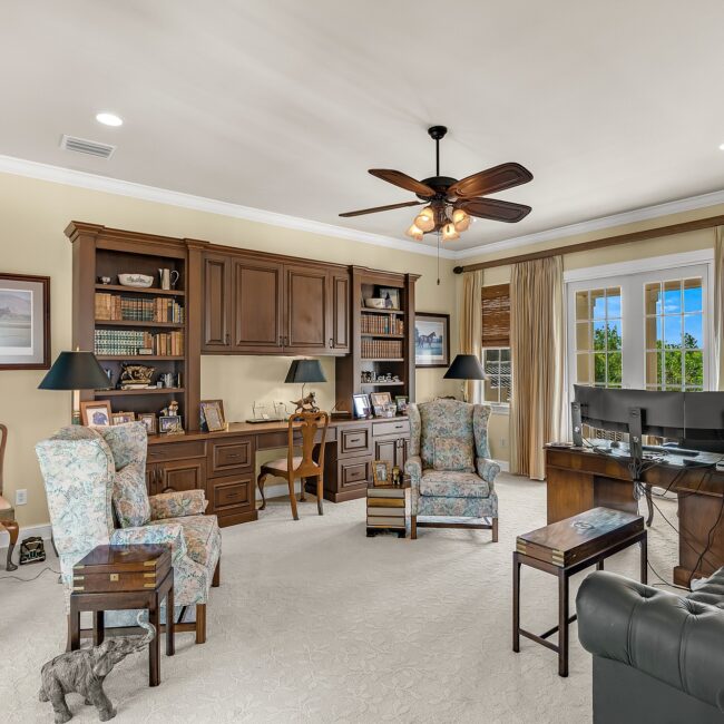 This beautifully maintained two-story residence showcases elegant architectural details and a thoughtfully designed floor plan. The first-floor primary suite offers a peaceful retreat, while a spacious guest suite with its own private bath and separate entrance provides privacy and flexibility. Soaring ceilings, custom built-ins in both the living and family rooms, and an open, light-filled layout create an inviting atmosphere for both everyday living and entertaining. The chef’s kitchen features a generous center island, gas range, wine cooler, and a cozy breakfast area overlooking lush greenery. Upstairs, a third ensuite bedroom and a large office/den open to a private balcony, perfect for working, relaxing, or enjoying tranquil views.