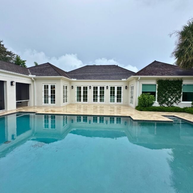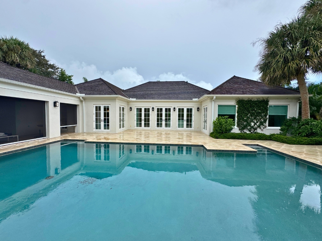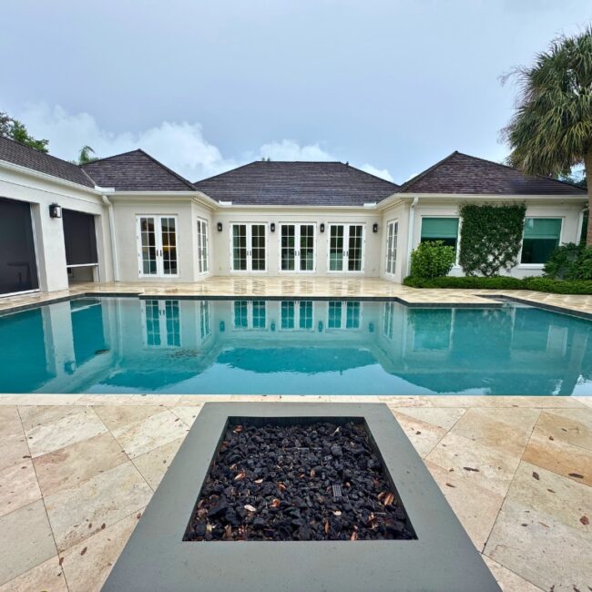 The reimagined layout features soaring cathedral ceilings, expansive windows, and bright, open living spaces with sweeping golf course views. A gourmet kitchen with a large island flows seamlessly into the family dining area, perfect for entertaining. A separate 1-bedroom guest cabana includes a bath, kitchenette, and screened veranda—ideal for visitors or extended stays. Outside, a new pool and firepit overlook the golf course, creating a resort-like atmosphere. The spacious primary suite provides a peaceful retreat, complemented by an office, impact-rated windows and doors, and a two-car garage.