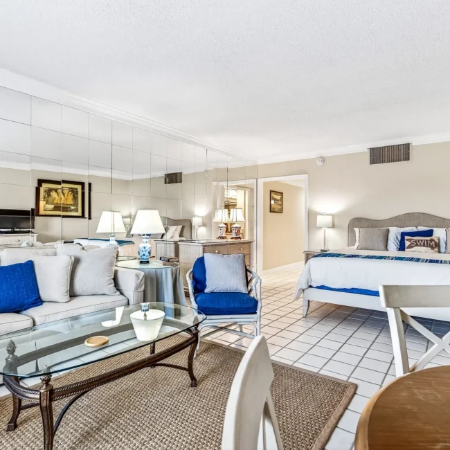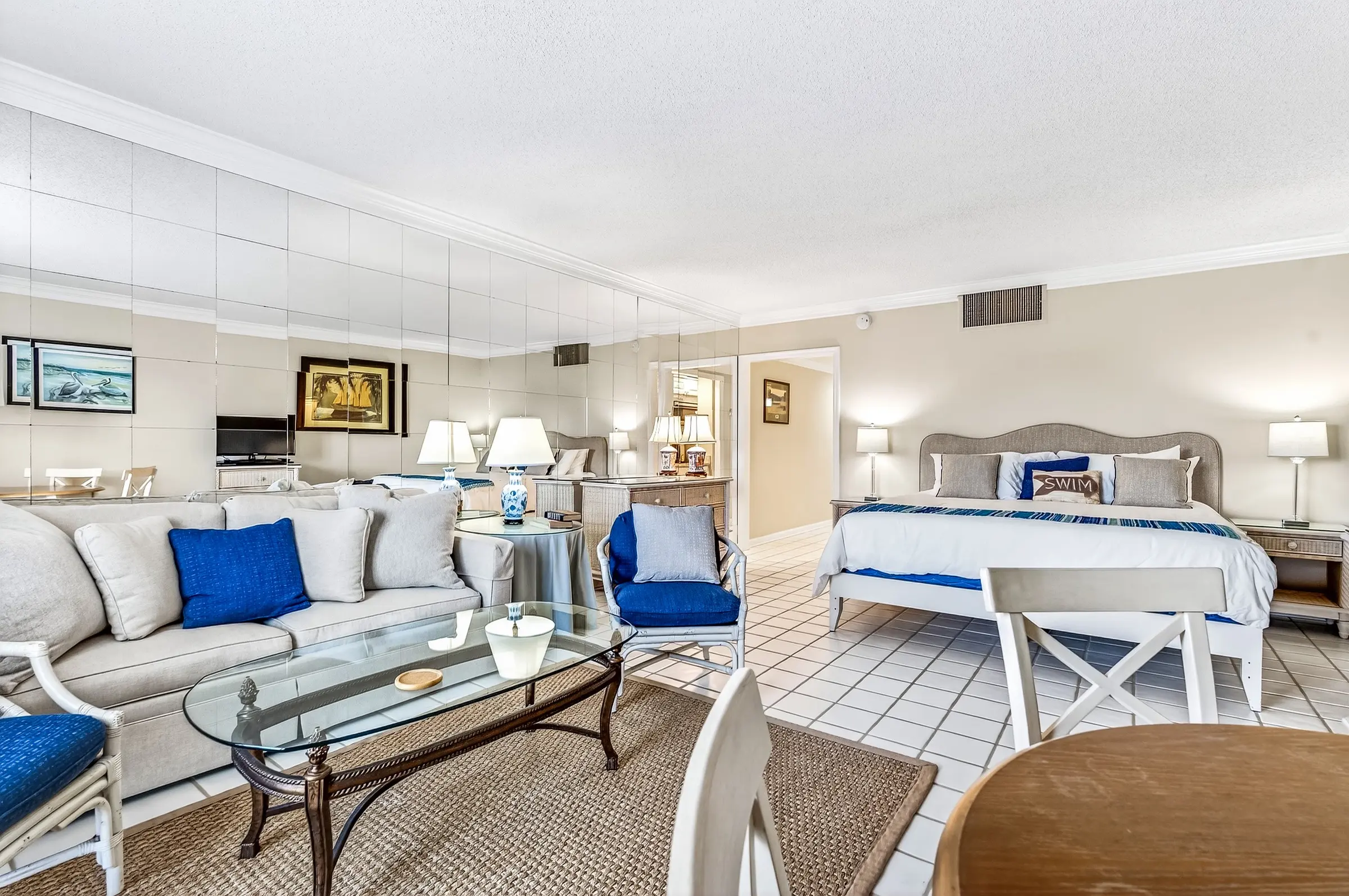 This light-filled oceanfront studio offers 590 square feet of thoughtfully designed space just steps from the community pool, private beach walk, and shimmering Atlantic.